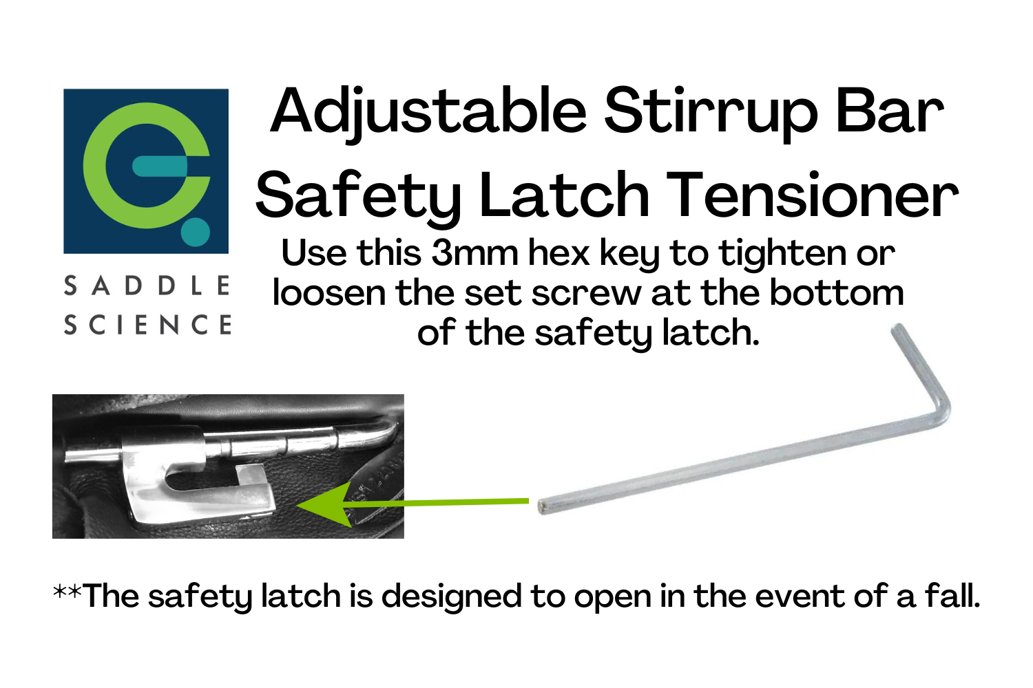 Our adjustable stirrup bar has a set screw at the base of the safety latch to allow the tension of the latch to be increased or decreased, in accordance with rider preference. This 3mm hex key allows you to easily loosen or tighten the tension of the safety latch, making it easier or more difficult to open.
