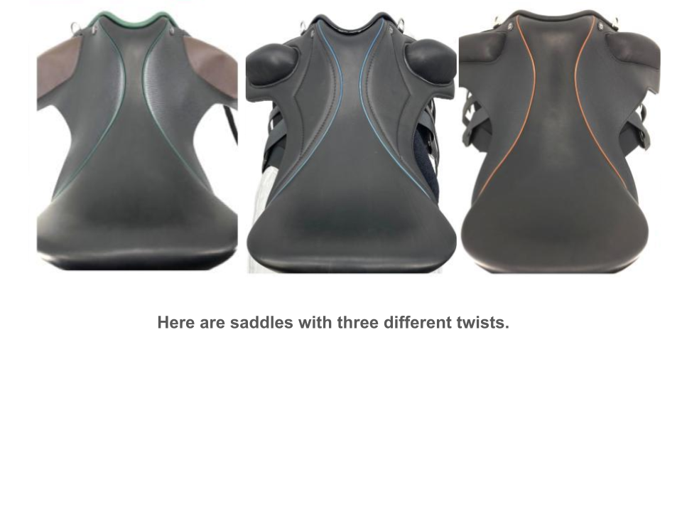 First, a definition: the twist of the saddle is assessed at the area where the two seams that attach the seat to the skirts come closest together. Often those seams define the twist, but not always. In terms of your anatomy, the twist is under or slightly in front of your pubic bone, and it should support the tops of your thighs. It is also critically important to realize that the twist includes the swells of the skirts, which have a great deal to do with the support you will - or won’t - get for your inner thighs. There is no such thing as a standard twist; the shape of the twist is dictated largely by the shape of the saddle tree, but also can be modified, possibly a great deal, when a saddle is built.